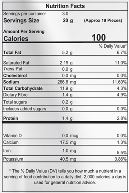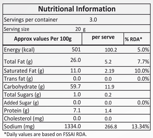 Sour Cream Crisps are made from amaranth millet (rajgira),naturally rich in calcium and iron, supporting bone strength and overall vitality. The creamy taste makes every snacking moment indulgent yet light. Crafted from 100% vegan, gluten-free, premium ingredients, these crisps are free from added sugars, palm oil and artificial colors. With zero trans-fat, Sour Cream Crisps provide a wholesome, guilt-free experience for mindful snacking.